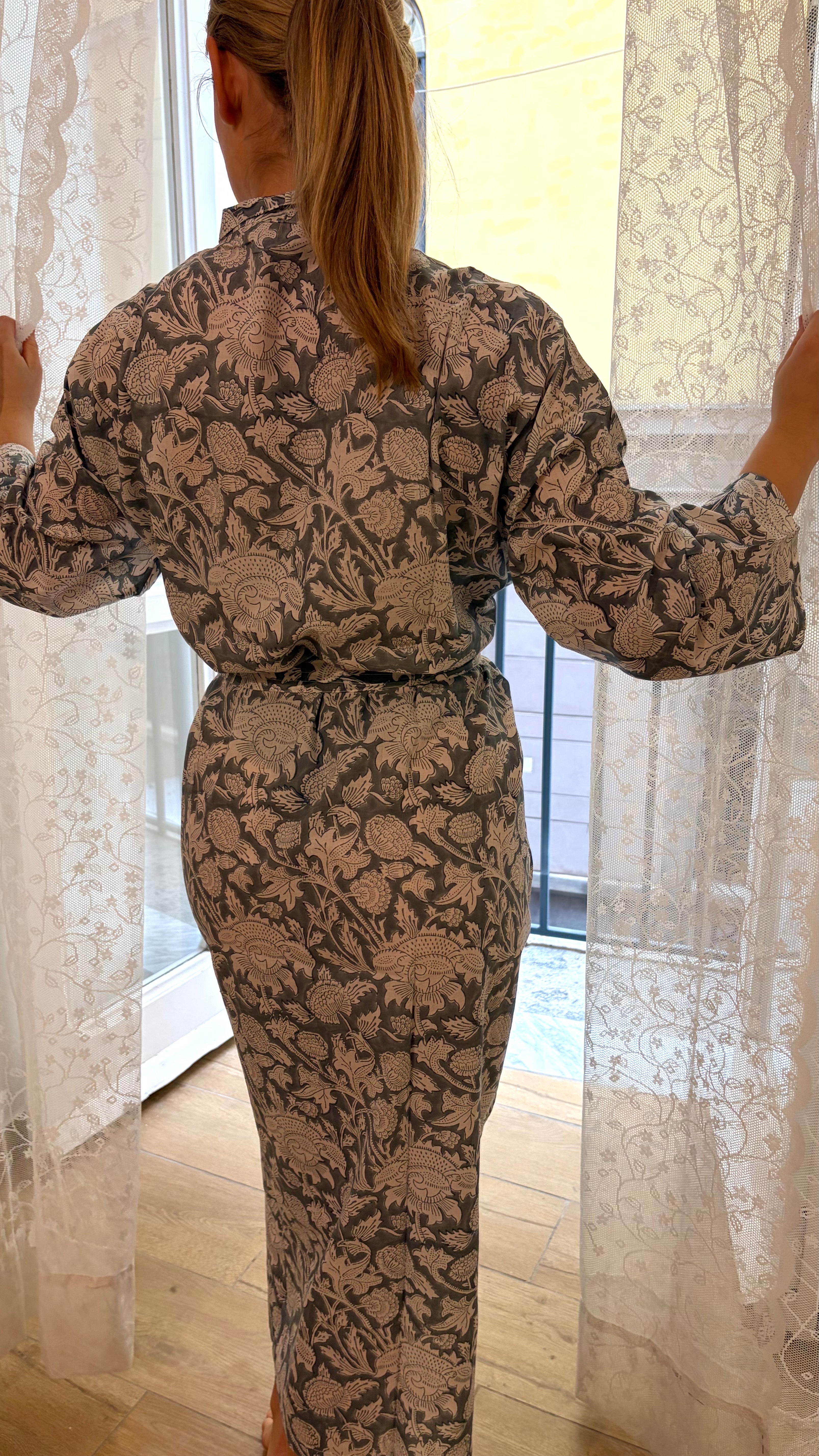 Beautiful 100% cotton kimono robe, perfect for wearing as sleepwear or loungewear. This robe is created using super lightweight and breathable cotton that becomes softer with every wash. The beautiful print is created using the ancient technique of hand block printing. This technique means each robe is a unique one-of-a-kind piece, and small imperfections may be present.